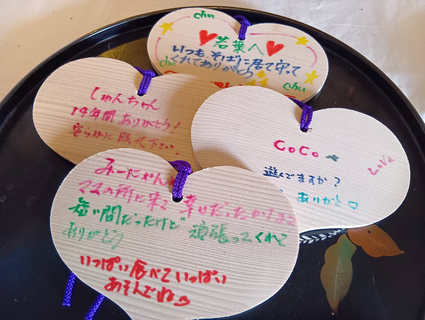 ハート型の木札に描かれたハートマークが、